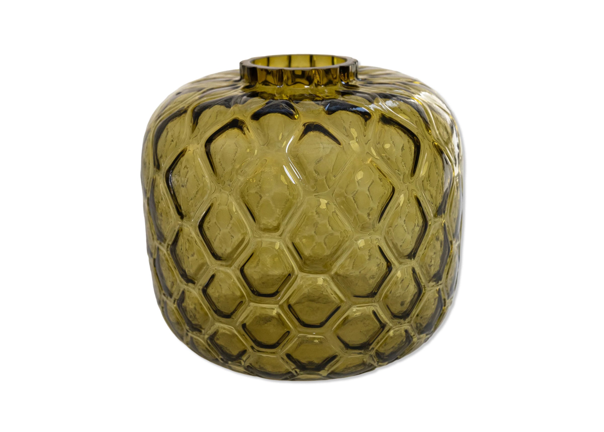 Geometrik Dokulu Yağ Yeşili Cam Vazo