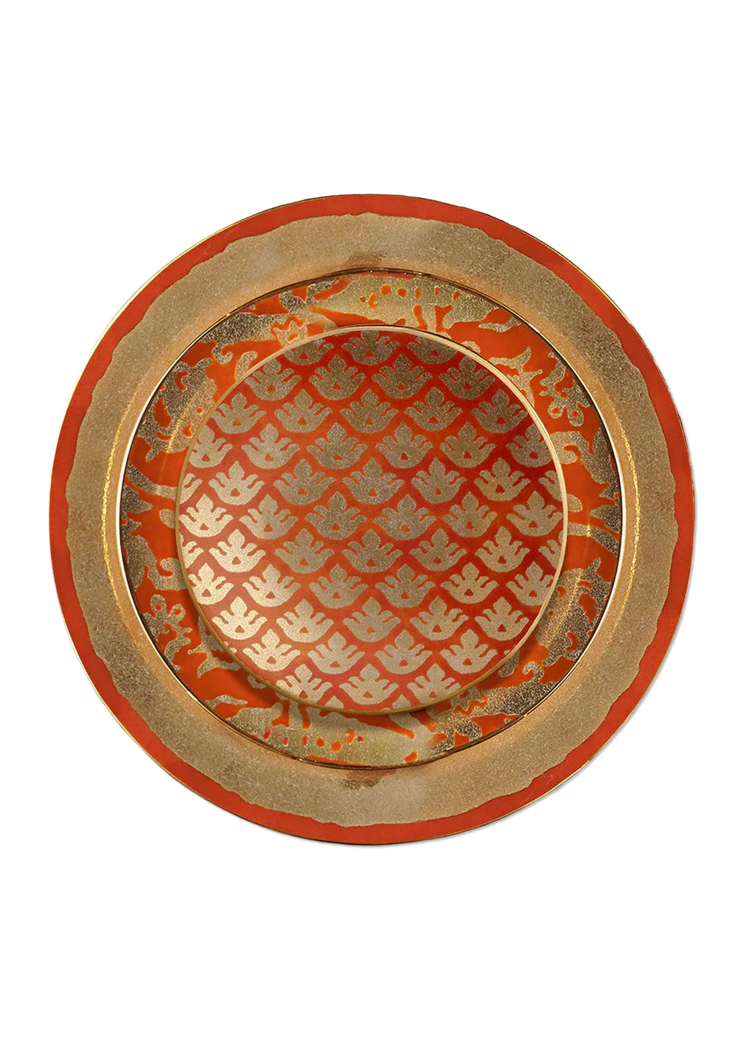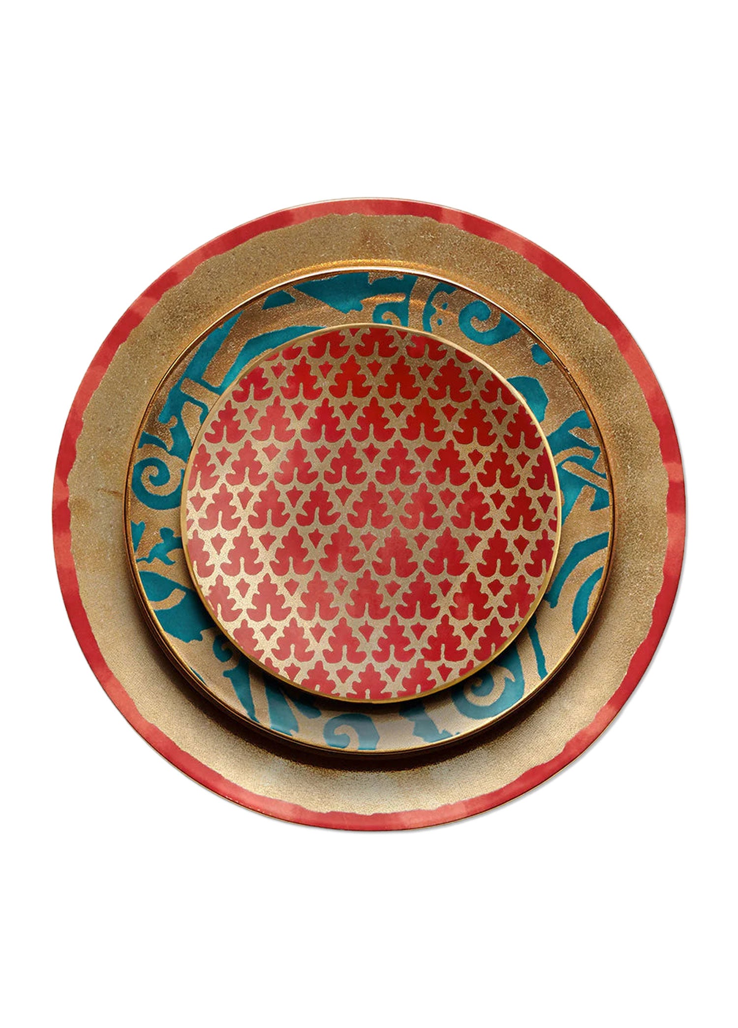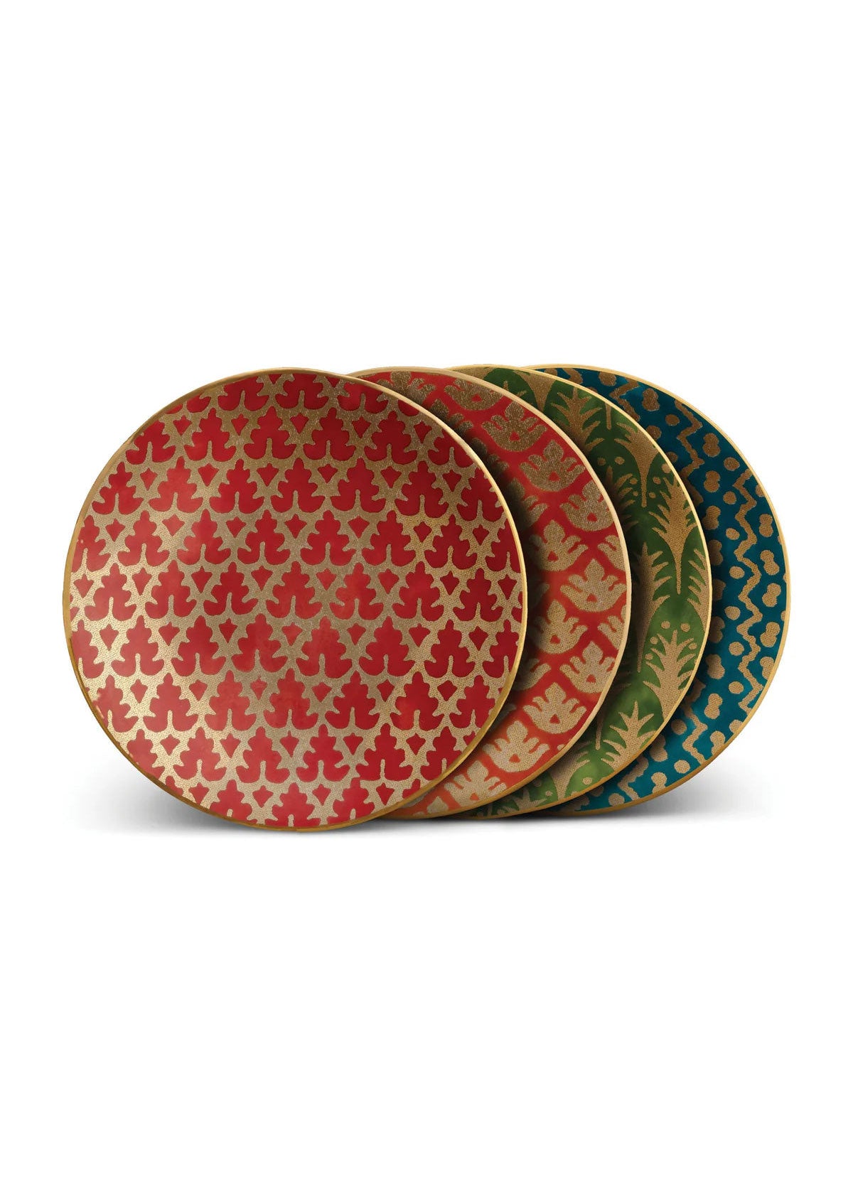 - 4 tatlı tabağı seti, 24K altın vurgularla toprak kaplar üzerinde prizmatik bir tasarım yelpazesi içerir.