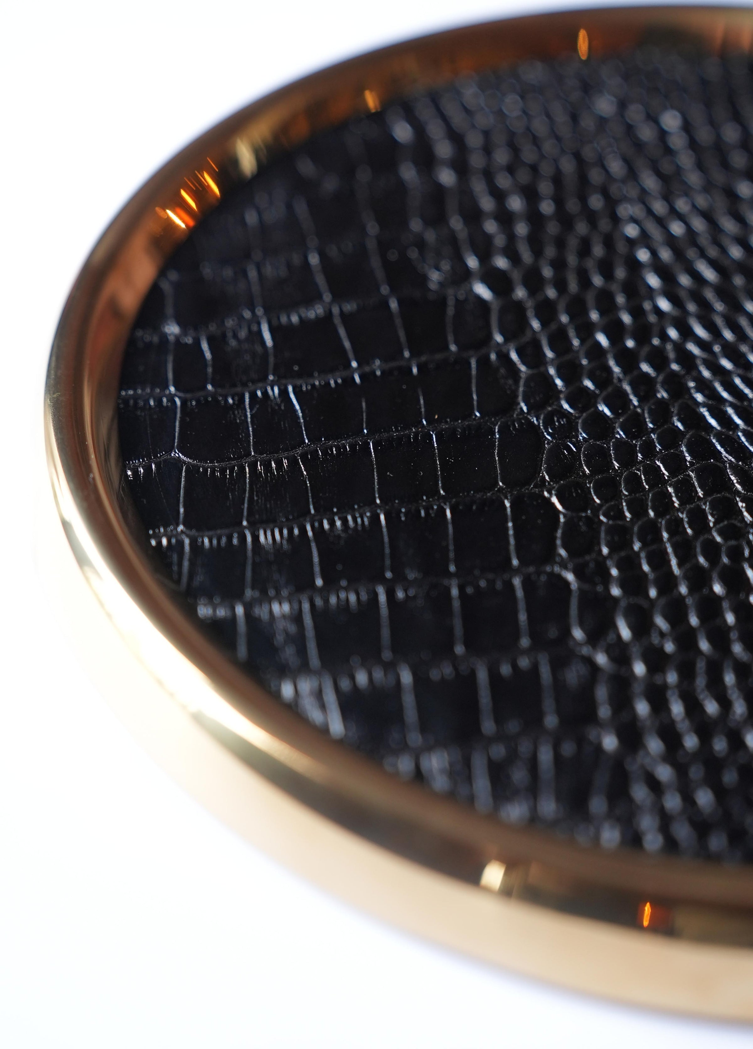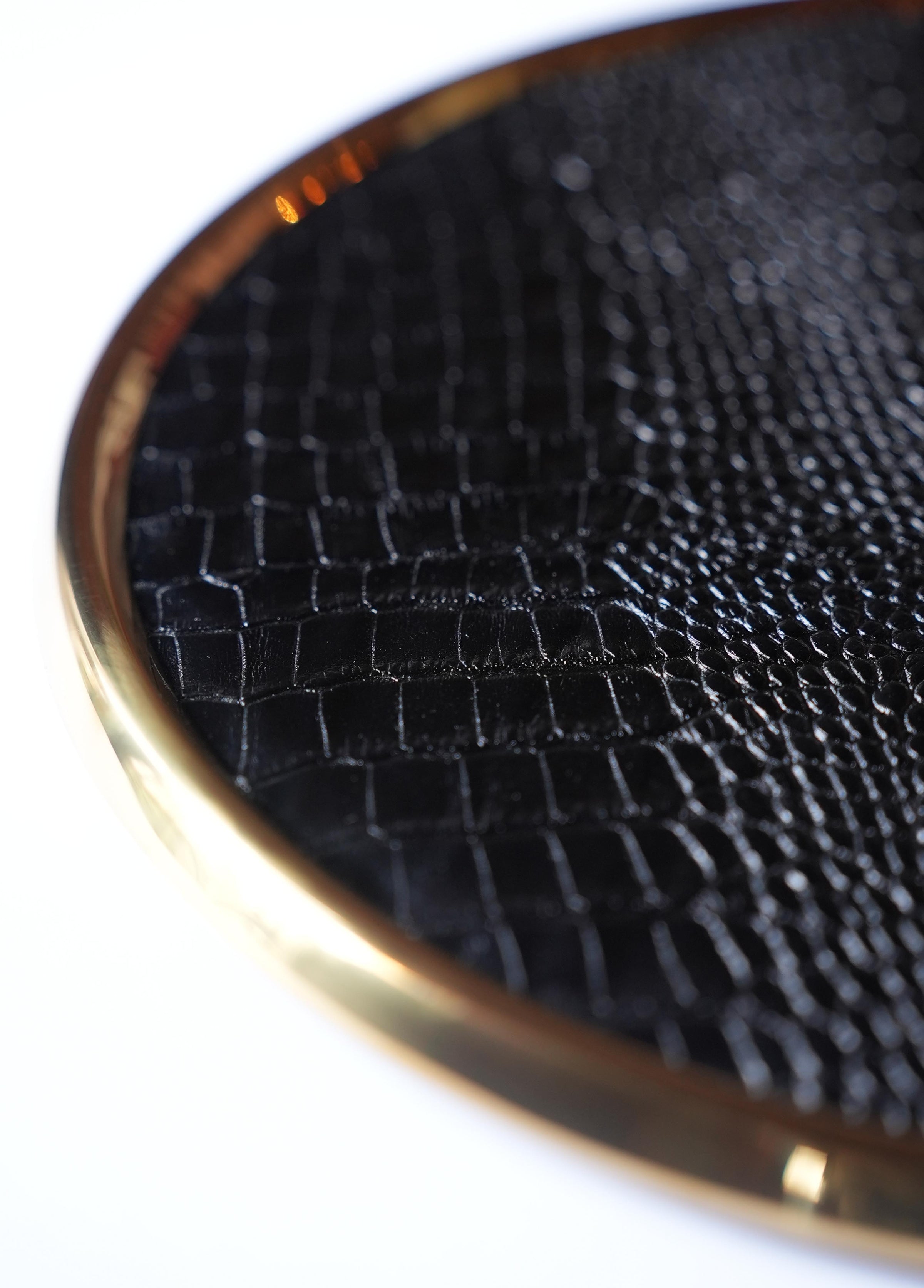 - Yuvarlak formlu, Siyah timsah deri detaylı küçük supla